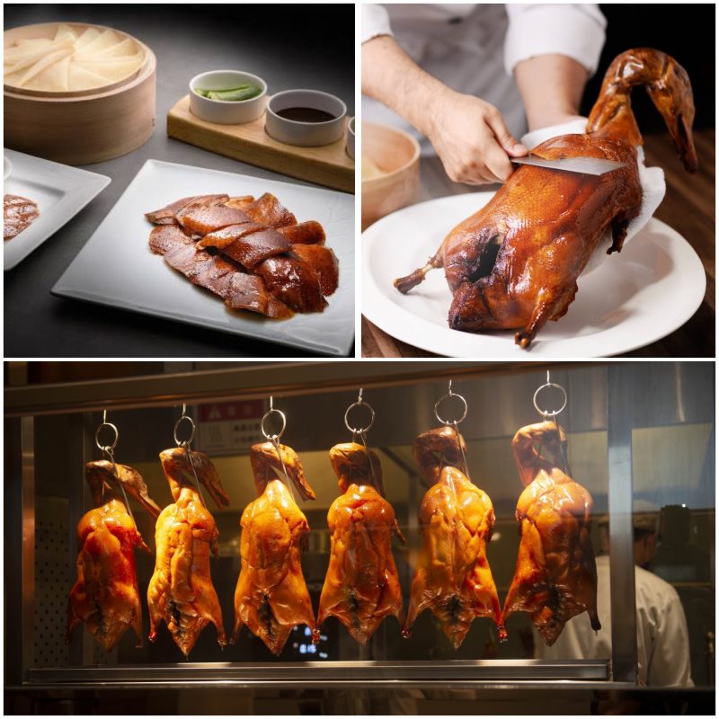 「上菜」選用品種最優質的宜蘭產櫻桃鴨,每隻重2.8公斤,主廚先以秘製鴨鹽、八角、香葉等數十種中藥材醃製入味後,在外皮淋上由麥芽糖及醋調制的鴨水,經吊掛風乾8~10小時等繁複工序,最後以傳統港式掛爐法,低溫烘烤1個小時製作出鴨皮油滋酥脆、鴨肉鮮嫩多汁不乾澀的美味片皮鴨。