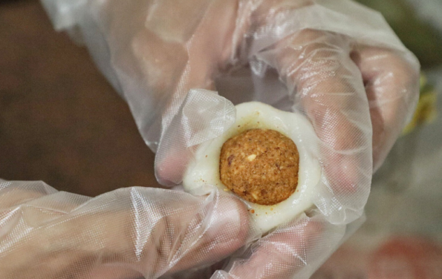 麻糬在客語裡又叫做「糍粑」,店家現點現做,麻糬皮的厚度比例剛剛好,每一顆包餡麻糬都會包上不少內糬,好誘人啊!