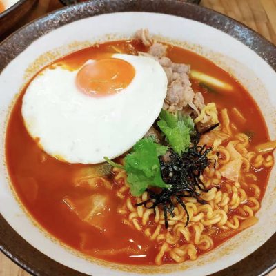 來自韓國的濃郁奶香辛拉麵炒泡麵,採用韓國大塊辛拉麵體,加上新鮮牛奶與辛辣醬汁,加入牛五花或豬五花,接著裹上起司片和太陽蛋,濃濃的奶香味與辛辣的醬汁融合,實在美味。