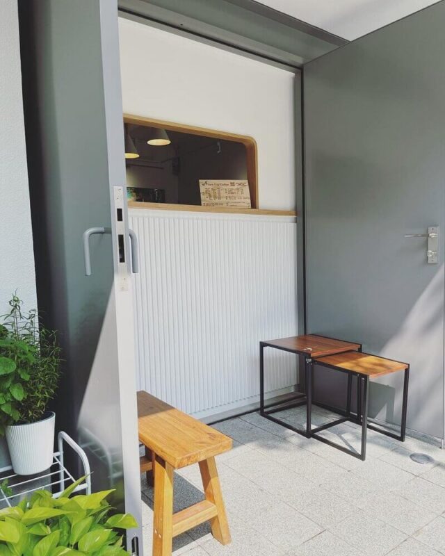 外帶窗口也十分有設計感,木質座椅是完美點綴