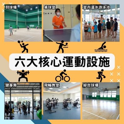 觀音國民運動中心內設有羽球場🏸、桌球室🏓、室內溫水游泳池 🏊、健身房🏋️、有氧教室🧘♀️、飛輪教室🚴♂️及綜合球場🏀等六大核心運動設施!