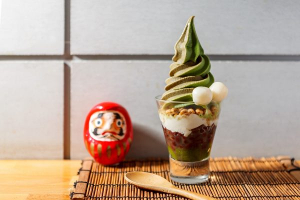 這款主打的「宇治抹茶聖代雙重奏」同時可以吃到抹茶和另一款當日口味的綜合霜淇淋,裡面的配料有特製抹茶凍、屏東萬丹產的紅豆、手工豆芙、甜麥、及白玉