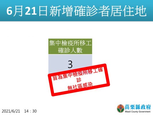 今日新增3例,均為外籍移工,皆為6月於集中檢疫所隔離10到14天,故無公共活動史,對於社區及工廠不會再產生影響。