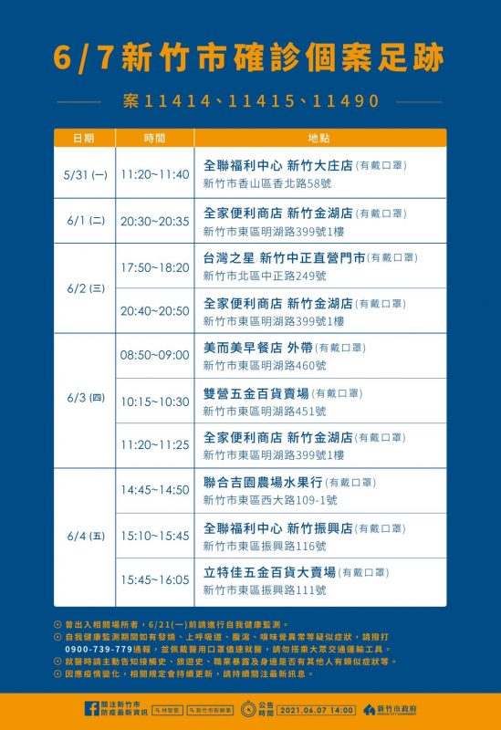 依據中央流行疫情指揮中心公布,新竹市今日新增3名COVID-19確診個案,案11414、11415、11490。案11414為40多歲女性,因同住者確診而被匡列,6月5號採檢後PCR陽性確診。