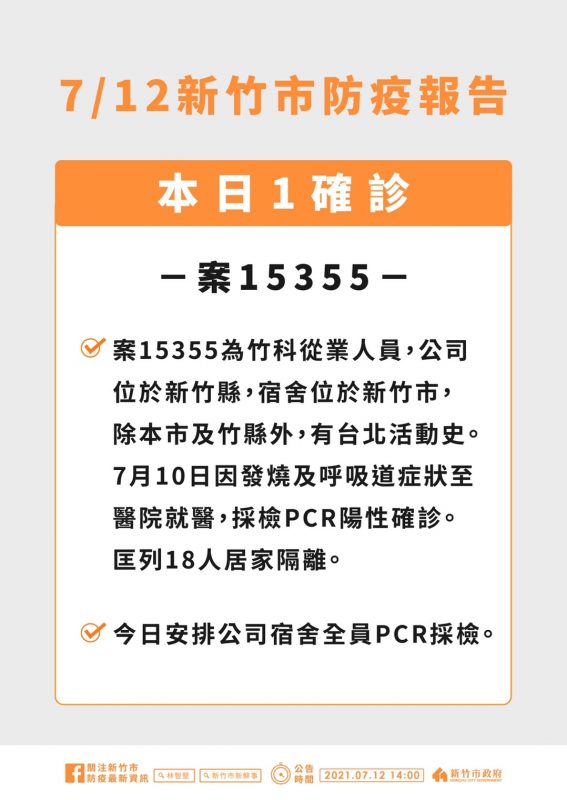 7/12竹市+1 竹科從業人員染疫, 有竹縣市與北市活動史 12 7 月 新竹市確診+1, 竹科從業人員染疫, 有竹縣、市與北市活動史。 竹縣與苗縣零確診。 編輯:邱昱甯 亞洲電台/亞太電台/飛揚調頻895 貼心提醒 防範新冠肺炎,應使用肥皂勤洗手,外出一定要戴上口罩 並避免餐廳內用,咳嗽禮節及佩戴口罩等個人防護措施 減少不必要移動、活動或集會,避免出入人多擁擠的場所 或高感染傳播風險場域,你我一起配合,為防疫第一線加油! 打疫苗後吃「5食物」效果更好 專家警告:5大行為母湯 台鐵7/13微解封!車廂內仍禁止飲食